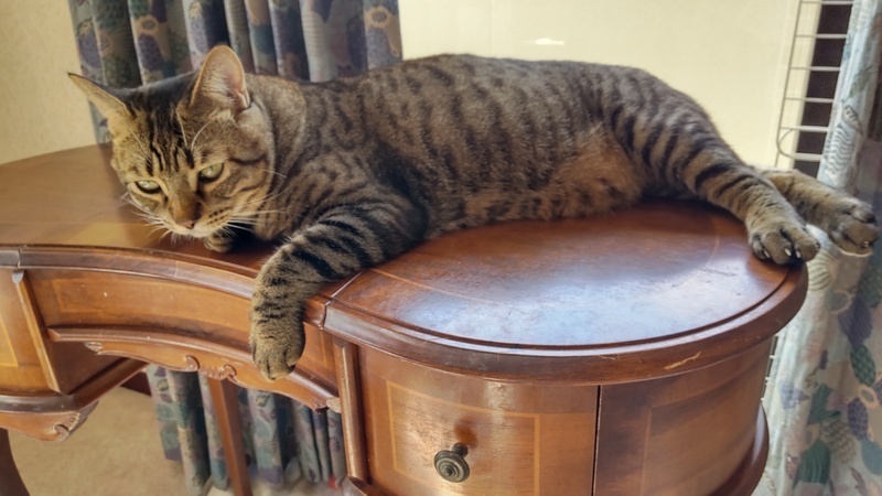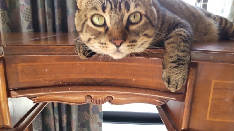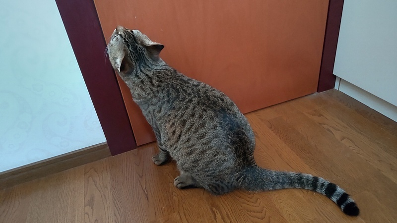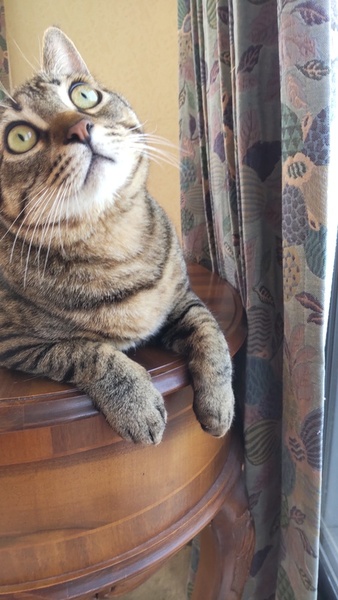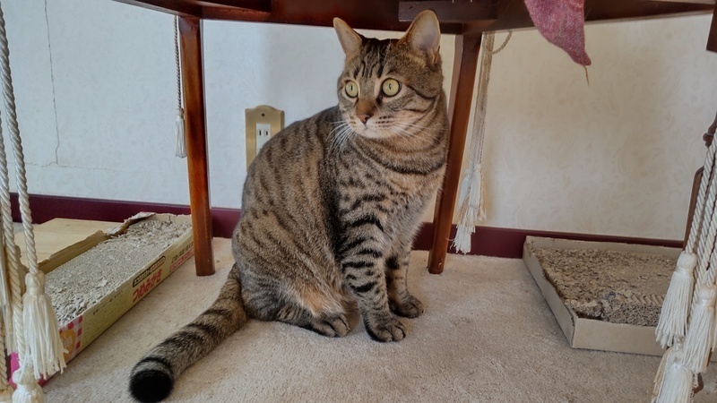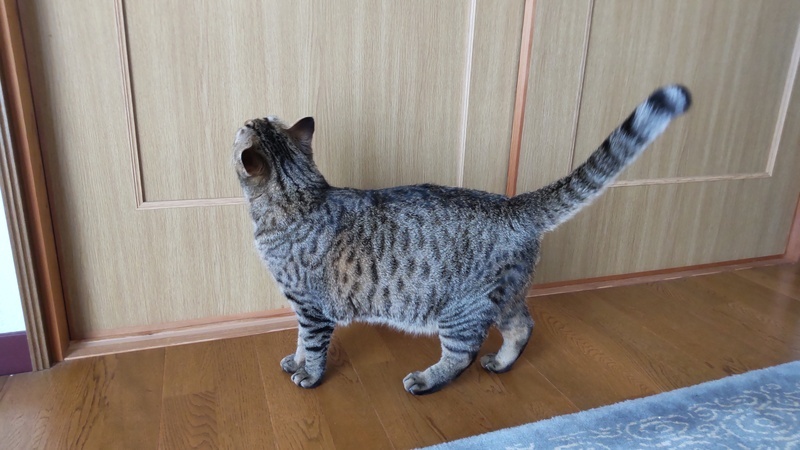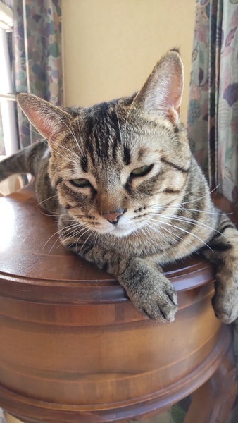 | 特徴(性格など) | 子猫の頃はよく吐いていましたが、大人になって安定し吐かなくなりました。 今も一応、胃に負担がかからないよう、以下の注意をしています。 ・食器は高さのある物(愛用している食器もお譲りします) ・一気食いを防ぐため、食べたら追加する。1日分を5回くらいに分けて与える ・カリカリは小粒~中粒くらい。大粒は消化に悪そうな気がします。 ・フードを変える場合は、1週間かけて少しずつ変えていく ・普段と違うものを多く食べると吐くので、オヤツは日に大匙1くらいまで 子猫の頃は暑さ寒さでも吐いていたので、人間と同じくらいの温度管理が必要です。 大きくてモフモフの手触りです。膝に乗って人の指をおしゃぶりする甘えん坊でしたが、同居猫が来たからか、そこまでおしゃぶりしなくなりました。 大きな瞳のイケメンさんです。 尻尾はまっすぐですが、触ると先だけ曲がっています。 子猫の頃はベンガル間違いないと言われましたが、去勢して太ってからキジトラ間違いないと言われました。 頭が良くて軽いドアレバーなら体重をかけて開けたりします。 同居猫を追いかけすぎるところがあるので、先住猫さんのいるお家は先住猫の逃げ場を確保する必要があると思います。 観葉植物を何でもかじってしまうので、ポトスなど猫に危険な物は置けません。 1㎝くらいの丁度よい大きさの物は誤飲しがちなので置かないようにしています。 トイレきちんと出来ます。体が大きいので、横幅が60cm近くあるライオンの獣医師開発猫トイレを愛用しています。 今のところは段ボール製爪とぎとタワーでのみ爪とぎしていて、家具等ではしません。絨毯をかじったり、ベッドサイドの布を引っかけて遊んだりはしています。 |