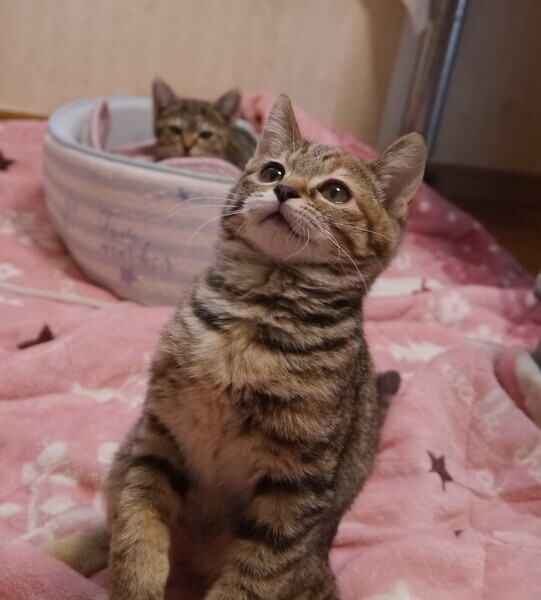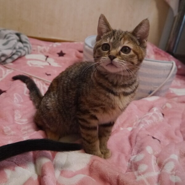 | 特徴(性格など) | さびキジの茶系色。 しっぽはまっすぐで長めです。 走るのが大好きで現在は姉妹と一緒に元気よく遊んでいます。 |