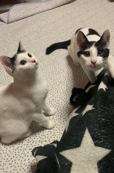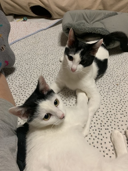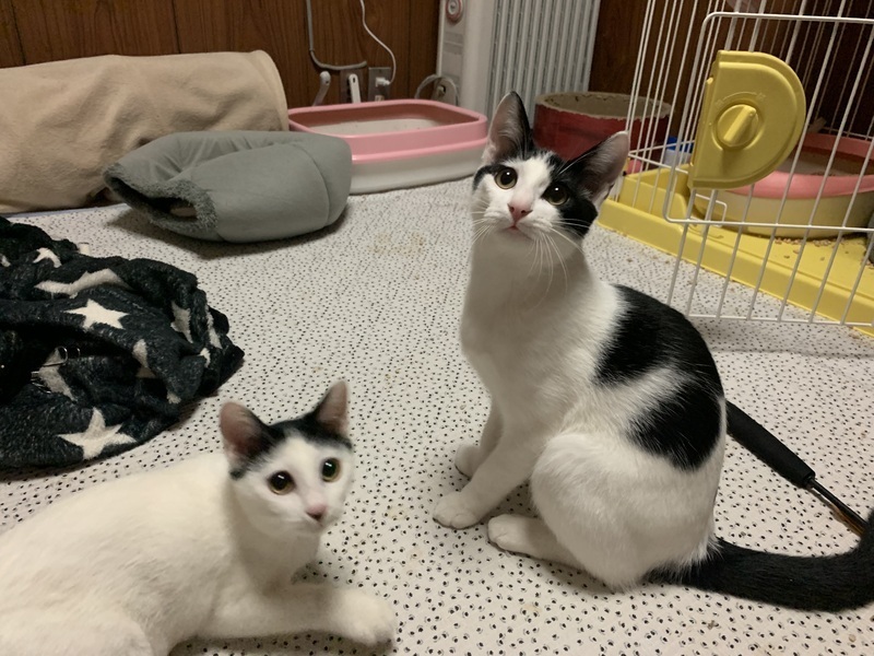 | 特徴(性格など) | 白黒のハチワレ模様で、もふもふの豆大福みたいな、かわいい2匹です。 別々に保護し、月齢も異なりますが、2匹とも白黒のハチワレで、兄妹のように仲良く育ちましたので、2匹一緒にお迎えいただけるご家庭が見つかればベストだと思っています。 ただ、それぞれに良い家庭を見つけることが最優先だと考えていますので、もし1匹でのお迎えをご希望の場合にもご相談ください。 ⚫︎ハナちゃん(男の子) 月齢:約6か月 ⚫︎くうちゃん(女の子) 月齢:約5か月 ハナちゃんは、ピンクの鼻と肉球、クリっとしたおめめ、単純で素直な性格が愛らしい男の子です。とっても甘えん坊で、抱っことおんぶ(笑)が大好きです。おおらかな性格で、人が大好き。ほとんど人見知りもせず、誰とでもすぐに打ち解けます。遊んでいる時も、「ぼくを見てー」と、おもちゃを誇らしげに見せにきます(笑) くうちゃんは、上品で小柄、美人さんな女の子。一方で男の子勝りのおてんばさんでもあります。おもちゃを追いかけて俊敏に走ります。性格的には、やや天然なところが可愛らしく、あまり細かいことは気にしないおおらかさがあります。 最初は少し人見知りをするかもしれませんが、慣れればゴロゴロいってお腹を出して甘えます。クリクリの大きなおめめで女の子らしくてとってもかわいいです。 不思議なことに、2匹とも猛禽類に襲われて大怪我をしたところを保護され、九死に一生を得るという似た境遇から保護に至りました。 それぞれ回復した段階で、一緒にしたところ、今では一緒に遊び、一緒に眠る仲良し兄妹になりました。 現在では後遺症も一切なく、元気いっぱい、好奇心旺盛で遊ぶのが大好き、子猫らしい愛らしさいっぱいです。 ●2匹とも猫エイズ・白血病陰性。ノミダニ寄生虫すべて駆虫済み。 ●トイレ指定の場所でちゃんとできます。(不適切な場所で粗相したことありません) ●オスのハナちゃんは去勢手術が済んでいます。 素直に愛情表現をする、可愛い子猫たちです。 人に対する基本的信頼がしっかりできていますので、スムーズに新しい家庭に順応できると思います。 この子たちにあたたかな家庭を与え、終生、家族として大事にしてくださる方、ぜひご連絡をお待ちしています。 |