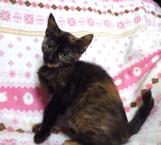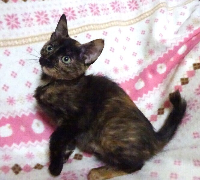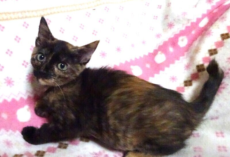 | 特徴(性格など) | 仮名: クリスティ(メス) 毛色: さび柄 性格: 小柄ですが活発に遊びます。 子猫同士でプロレスをしていて、小さいので泣かされていますが、懲りずにまた始めます。 他の猫ともうまく付き合えるようです。 威嚇なく、抱っこや爪切りや薬を飲む事も出来ますが、じっと抱っこするよりも遊びに行きたいほうが先で落ち着いて抱っこさせてくれません。 よほど眠い時は大丈夫です。 ミルク育ちなので、人馴れはしていて、いつでも触れます。 留守番は出来ますが、寂しがりやのところもあるので、留守番時間は短めのご家庭を希望致します。 お届けは千葉県内で車で1時間圏内でお願いします。 検便済 駆虫済 ワクチン済 避妊手術済 猫エイズ・白血病ウィルス検査はともに陰性です |