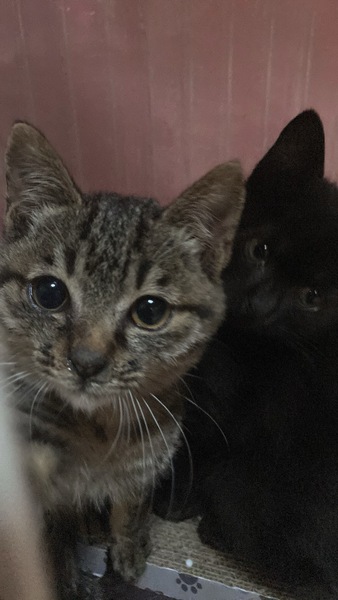 | 特徴(性格など) | ☆とても仲良しの兄妹猫ちゃんです☆ ・クロの男の子 ボールやネズミのおもちゃが大好きで、 一生懸命追いかけています♪♪ ・キジトラの女の子 くるくる回るおもちゃで遊んだり、 誰よりも丁寧に爪とぎをします♪♪ とても元気で愛らしい子たちです。 いつも一緒のベッドで2匹でくっついて 寝ています。 仲良しで好奇心が旺盛で、 食べることが大好きな兄妹は まさに“福ねこちゃん”です!! 病院の便検査の後に駆虫しました。 ウィルス検査も大丈夫でした。 保護した直後は風邪を引いていましたが、 しっかりと温めて、お薬も飲んでいるので 鼻水も目やにもほぼ無くなってきました。 (写真では少し残っています^^) 体重は現在約1.3㎏前後です。 ノミダニは保護したお直後に駆除済みです。 |