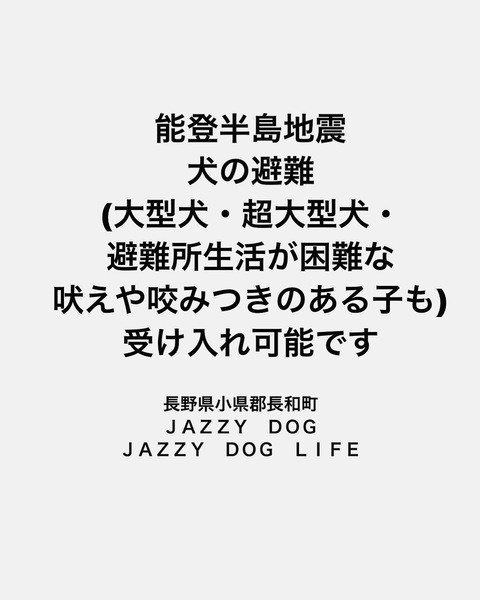 | 特徴(性格など) | 【犬の避難所】 能登半島地震により被災された皆さまに心よりお見舞い申し上げます。 長野県小県郡(ちいさがたぐん)長和町にあります 特定非営利活動法人JAZZY DOG LIFEの保護犬預かりスペースにて、避難の必要がなくなるまでの間ワンちゃんのお預かりが可能です。 小型犬〜超大型犬、避難生活が困難な子もご相談ください。 |
