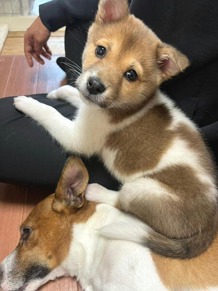 | 特徴(性格など) | 性格:人の手により育てられましたので人が大好き、甘えん坊くんオス子犬。とても人なつこく猫とも他の犬たちとも仲良く出来ています。甘噛みが始まる頃です。トイレの躾けも身につきました。前肢に少し障害がありましたが治療済み、日常生活は支障なく元気に走り飛び跳ねています。 医療面:健診済み・駆虫済み・ノミダニ予防済み 今はワクチン未接種ですが譲渡時にはワクチン接種済みで対応させて頂きます。 その他:成犬時予想は比較的、小ぶりかも知れません。9頭の兄妹ですが皆、小ぶりの感じです。 |