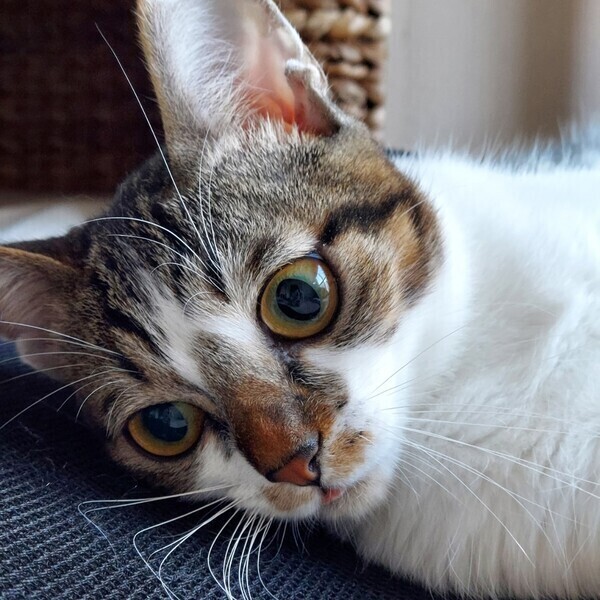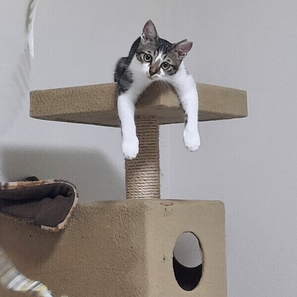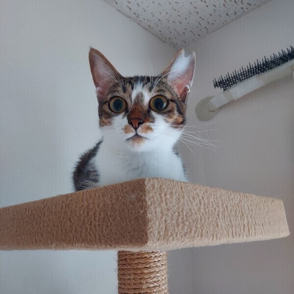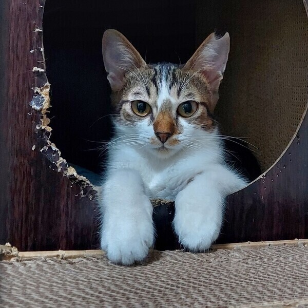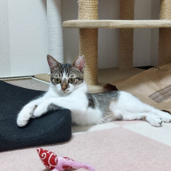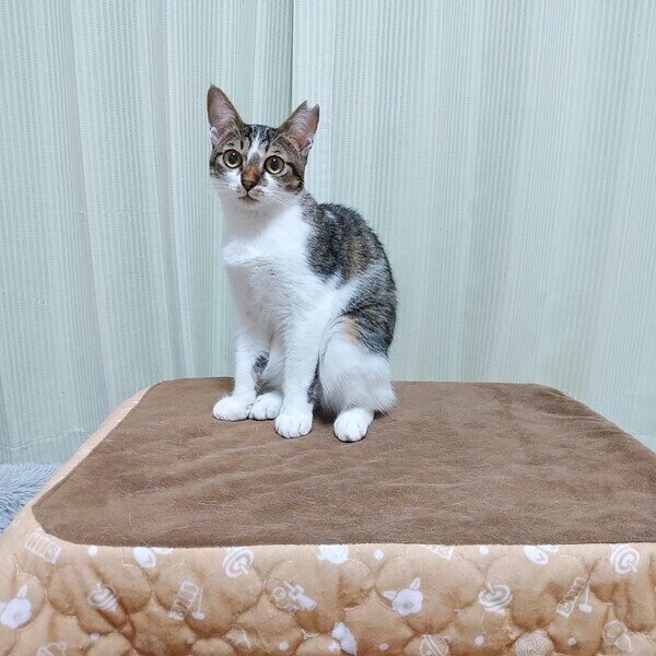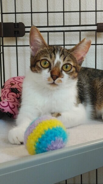 | 特徴(性格など) | 【仮名】はなちゃん 【外見】キジミケ・短いしっぽ・小顔・小柄 【性格】おてんば・活発・あそび大好き・猫好き(先住猫OK)・いたずら・好奇心旺盛・警戒 心強め 【しつけ】トイレしつけ済(固まる猫砂)粗相は一度もありません。お留守番OK 保護当初はシャーシャー猫パンチが飛んでくる猫でしたが、現在はシャーシャーはほとんどなくなりました。指につけたちゅーるをペロペロしたり、手からおやつを食べられます。人とおもちゃで遊ぶのが大好きです。おもちゃで遊ぶととても喜びます。遊び疲れるとすぐ眠くなってしまう子猫らしさも可愛いです。先住猫(若猫~シニア猫)とも仲良くしています。ポンポンでお顔まわりをなでなですると気持ちよさそうに喉をゴロゴロ鳴らすようになりました!! 現在、まだ人の手には距離を置きたい感じですが、人慣れ修行中であり今後の伸びしろが大いにある子です。猫が心を開くまで気長にお付き合いできる方のご応募お待ちしております。 |
