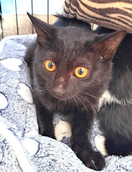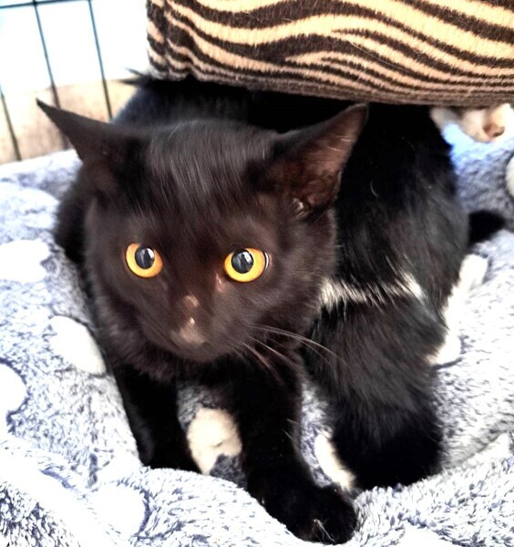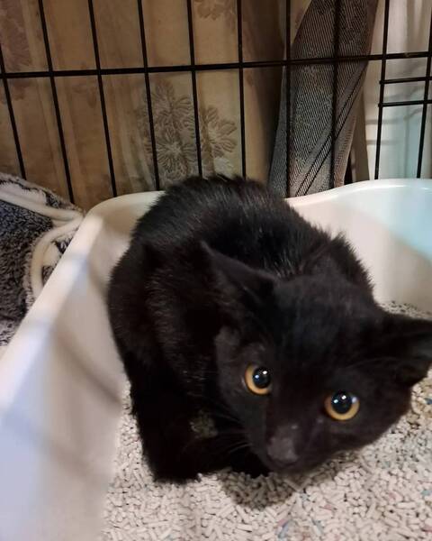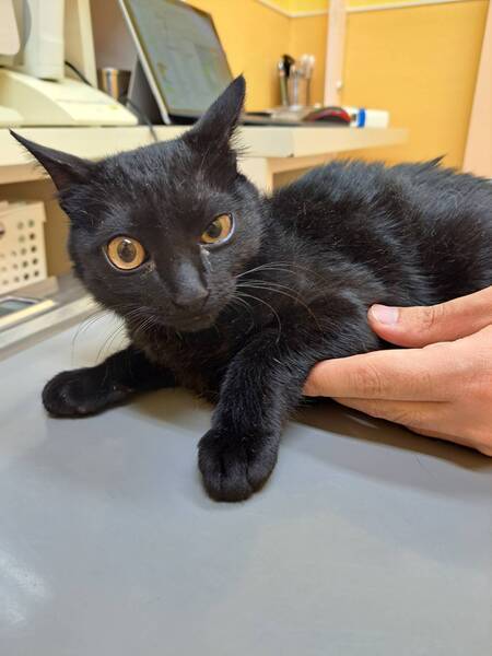 | 特徴(性格など) | 仮名: 吟くん(オス) 毛色: 黒猫 性格: ビビりくんです。 撫でようとするとシャーと言いますが、言っているだけでパンチしたりの攻撃性はありませんので、撫でています。 抱っこすると固まってしまうタイプ。 食べる事、遊ぶ事は大好きなので、おもちゃで遊んだり、他の大人猫達と一緒に遊びます。 怖がりなのに、好奇心旺盛で探検が大好きです。 保護時に負傷したようで、両前脚小指の爪が抜けていますが、生活に支障はありません。 他猫ともうまく付き合えるので先住猫がいるお家でも大丈夫です。 検便済 駆虫済 ワクチン済 去勢手術済 猫エイズ・白血病ウィルス検査はともに陰性です |
