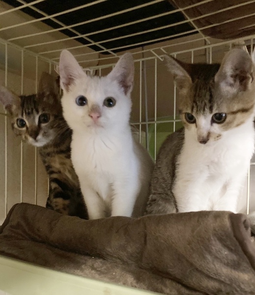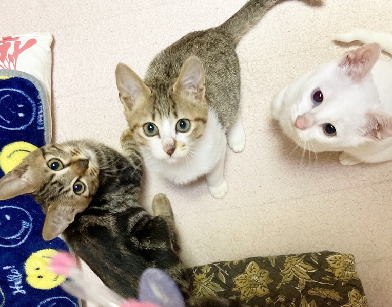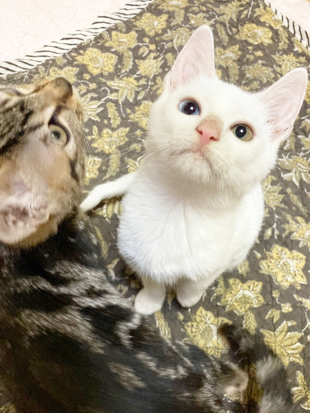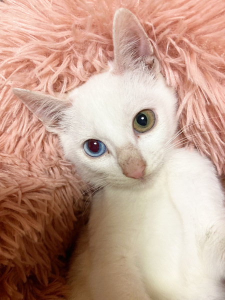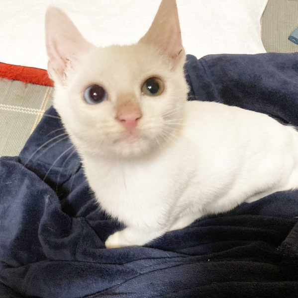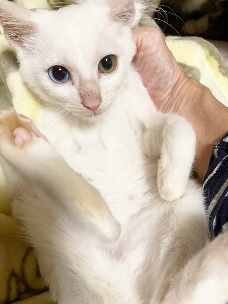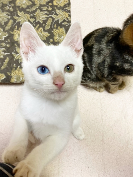 | 特徴(性格など) | ✳︎特徴 全身真っ白の男の子です。目を引くのはやはりオッドアイ!数が少ないので幸運を運ぶなど言われたりしますが、どんな瞳の子でも幸せは運んでくれます(笑)お鼻と肉球のピンク色が白い毛に映えて可愛いです。 尻尾は真っ直ぐです。洋猫さんの血が入っている可能性が高い男の子なので、成長したら大きめサイズになるかもしれません。 ✳︎性格 人見知り、場所見知りを全くしません。むしろニンゲン大好き!いっぱい甘えたいキャラ!遺棄された可能性が高いとはいえ、飼育されていた先では虐待などはされていなかったのだと思います。 たくさんの兄妹たちとずっと一緒に過ごしているので遊ぶのも大好きで、保護主さん宅でおもちゃ遊びを満喫しているそうです。 ✳︎健康状態 保護時はやや脱水しており寄生虫も発見されましたが、すべて処置が完了しております。現在は良好で食欲も戻り好き嫌いなく食べています。 オッドアイの猫さんは聴覚に異常が出やすいと言われておりますが、今のところ音にはきちんと反応しています。 今後成長していく中で、もしかしたら何か症状が出てくるかもしれません。完全室内で飼育している分には、多少聴力に問題があっても支障はないと思いますが、耳が聞こえにくい状況で、万が一脱走した場合、事故に遭うリスクがかなり高くなってしまいます。そのため特に戸建てにお住まいの方は、念の為脱走防止の対策をしっかり目にお願いいたします。 これから4ヶ月くらいまでの間は、子猫さんの社会性が育つ時期になります。取っ組み合いの喧嘩をしながら、甘噛みを覚えたり、追いかけっこしながら、動体視力を養っていきます。 今は、兄妹や、他の子猫さんたちと一緒に過ごしています。できれば、兄妹2頭一緒に迎えてくださるお宅や、一緒に遊べる若い先住猫さんがいるお宅、お留守番があまり長くなく猫さんと一緒に遊ぶ時間が十分取れるお宅を優先させていただきたいと考えております。 |