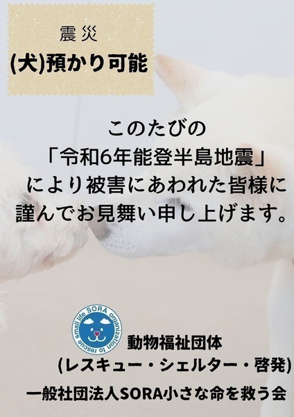 | 里親募集する理由 | このたびの「令和6年能登半島地震」により被害にあわれた皆様に謹んでお見舞い申し上げます。 私たちは、愛知県名古屋市の動物福祉団体(レスキュー•啓蒙活動•保護犬ケア用シェルターの運営)「一般社団法人SORA 小さな命を救う会」と申します。 現在スタッフ約150名程で運営しており、保護犬シェルターだけでなく一般家庭宅での保護犬預かりボランティアスタッフもいるため、ゆっくり預かり犬の対応をさせていただきますので心と体のケアができます。ベテランの優しいスタッフばかりですのでご安心下さい。 以前、東日本大震災にも保護犬預かりや搬送経験があり、被災された皆様のお力になれれば幸いです。まずはお互い信頼関係を持ってお話していけたらと思っております。 SORA公式サイト https://sora-chiisana.org/ SORA 保護活動ブログ https://ameblo.jp/sora-chiisana-inochi/ SORA Instagram https://www.instagram.com/sora_save.dogs 直通メールアドレス dog-rescue@sora-chiisana.org |