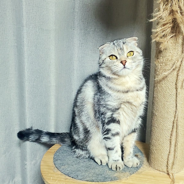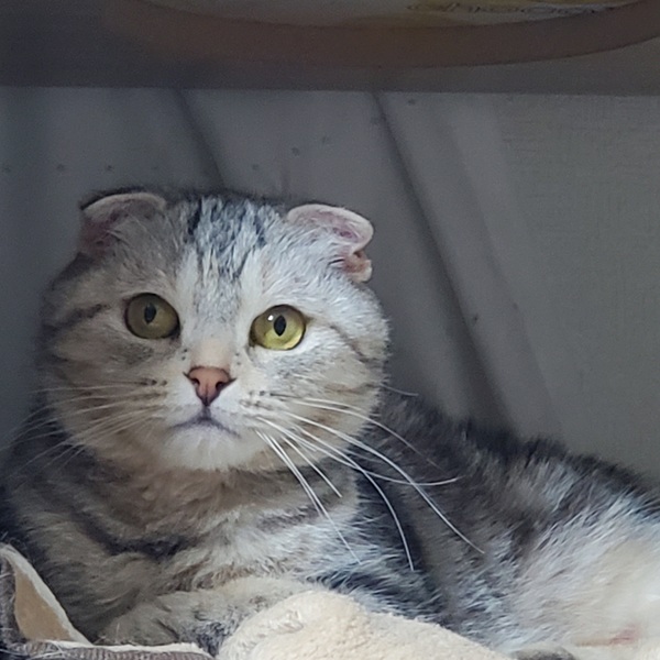 | 特徴(性格など) | スコティッシュフォールド折れ耳のキャリコ(血統書)の女の子です。 甘えん坊で隣で寝たり、もふもふをしてくれます。 2歳の頃歯肉炎がひどくなりほとんどの歯を抜いて治療しています。 食事など特に問題はありません。 その後は特に問題なく過ごしています。 |