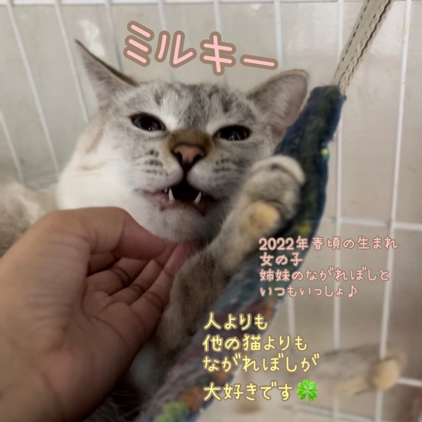 | 里親募集する理由 | TNR現場からの保護です。 ながれぼしとミルキーは仲良し姉妹、 ふたりとも白血病陽性の子たちです。 一緒にお迎えいただけますと2倍幸せです。 詳しい保護経緯はこちらにてご報告しております: https://ameblo.jp/tsunagu-cat/entry-12765766482.html ウイルス検査の再検査結果ご報告記事はこちらです: https://ameblo.jp/tsunagu-cat/entry-12774015507.html |