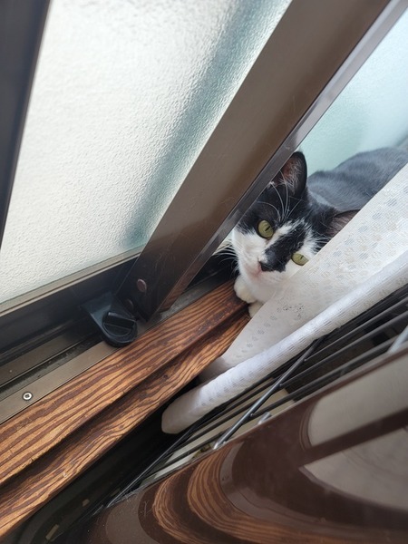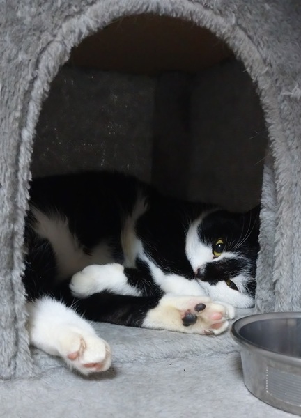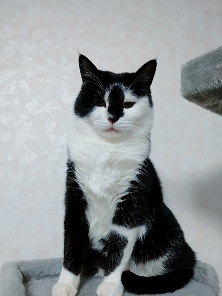 | 特徴(性格など) | 白地に黒の模様で、黄色い目をしています。 臆病でよく物音とかにもびっくりしています。しかし、なれたら近づい来てくれます。 チュールがとても大好きです。 |