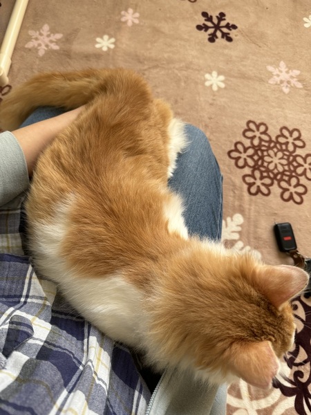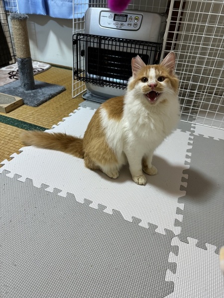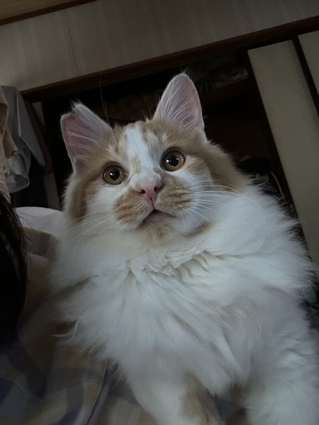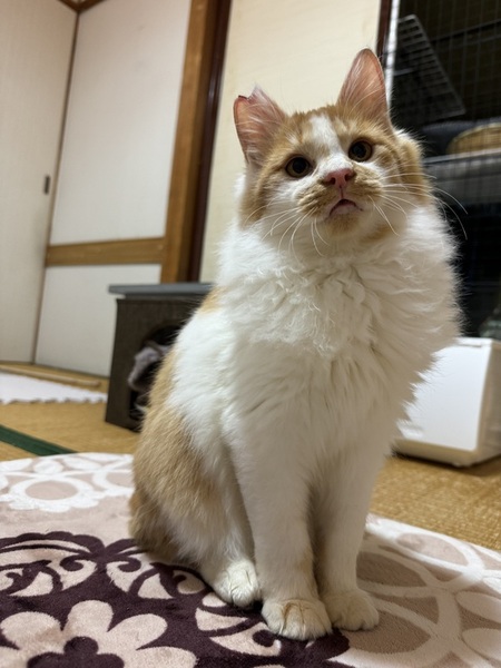 | 特徴(性格など) | 白茶長毛でふわふわの毛です。 尻尾は茶色でまっすぐ曲がりはありません。 地域猫としてTNR予定でしたので、さくら耳カットをしています。 1月現在、体重はおよそ3キロです。 大柄な猫さんになるかもしれません。 猫エイズと白血病の検査をしたところ、猫エイズに陽性反応が出てしまいました。 2月中旬にもう一度検査予定です。 駆虫は終了しています。 爪切りやブラッシングは苦手で、2人で気を逸らしながら行っています。 上記の通り人懐こさはバツグンです。人間が座ると高確率で膝の上に乗ってきます。 手先も器用なようで、ふすまは開けてしまいますし、扉も上手に開けてしまいますので、脱走防止や、入っていけない部屋がある場合はご注意ください。 |