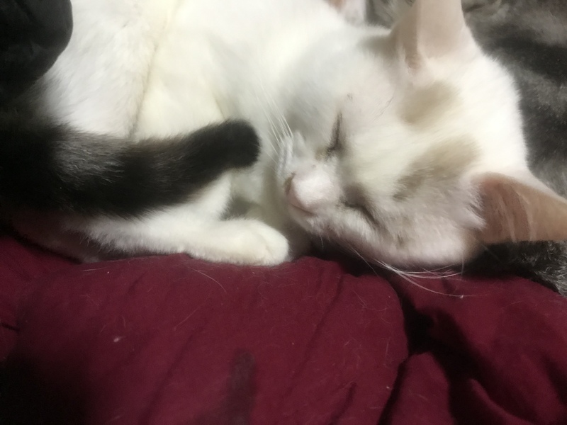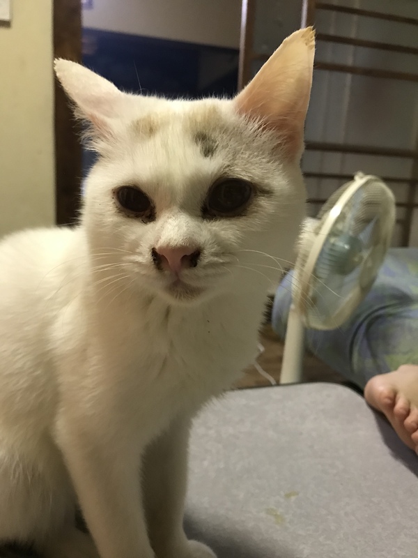 | 特徴(性格など) | 真っ白で背中のとこに茶色の模様があります。 尻尾は長くて黒、茶色です。 性格は大人しく、人馴れしていて、甘えん坊でいつも膝の上に乗ってます。たまあにおんぶもします。 |