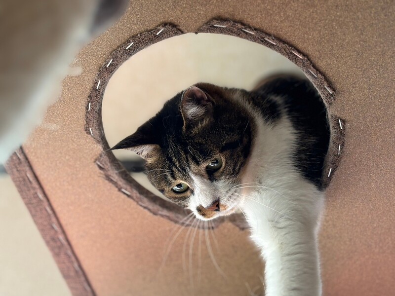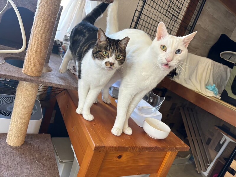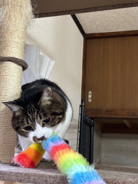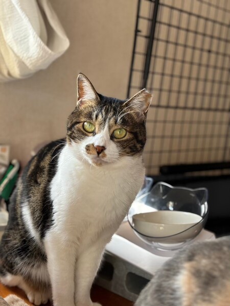 | 特徴(性格など) | 少しこわがりさんですが、好奇心と食欲は旺盛で自分から新しい環境へ探検していく子です。 高いところよりも隠れることの方が好きで、人よりも猫同士のコミュニケーションの方が上手です。 慎重な性格ですが、おもちゃで遊ぶことも好きなようなので慣れてくれれば甘えん坊さんかもしれません。 |