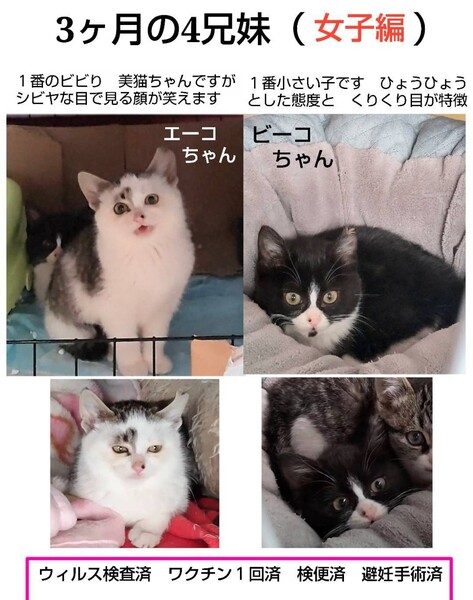 | その他(譲渡条件など) | 4兄妹のため 2匹一緒に という方を優先させてください 若い先住猫さんが居るお留守番の少ない家庭でしたら 1匹でも可。 完全室内飼いで脱走防止対策もお願い致します 二段ケージもご用意くださいm(__)m 高齢者の方はごめんなさい 単身者の方は 後見人が必要になります 簡単なアンケートに答えていただくようになりますので ご協力のほど 宜しくお願い致します 臆病ですが とても 可愛い子たちです 宜しくお願い致します? |