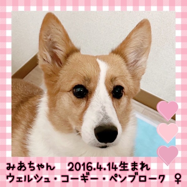 | 特徴(性格など) | 名前 みあ 種類 ウェルシュ・コーギー・ペンブローク 色 セーブル&ホワイト 年齢 2016/4/14 性別 メス 体重 12.1kg ..................... ワクチン 5種混合接種済 フィラリア 陰性(ー) マイクロチップ 装着済 避妊去勢手術 済 メディカルチェック 聴診触診、血液、検便、異常なし、 駆虫薬投与、ノミダニ駆除済、 |
