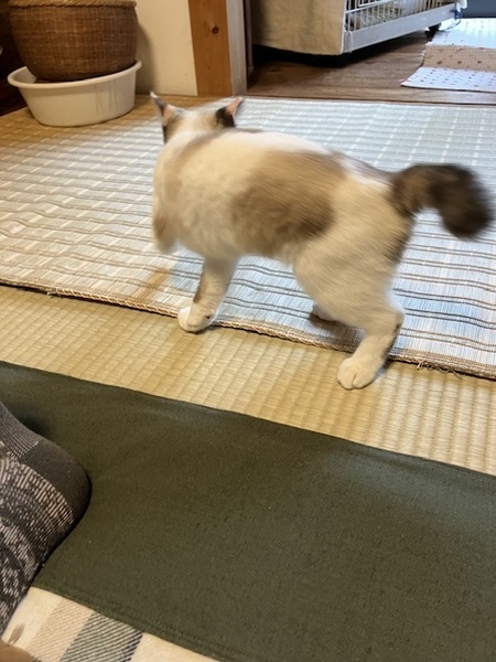 | 特徴(性格など) | シャム風ミックスで尻尾はカギシッポです。 性格はおっとり、遊び好き。 人間にはふみふみして甘えん坊です。 |