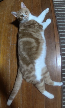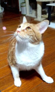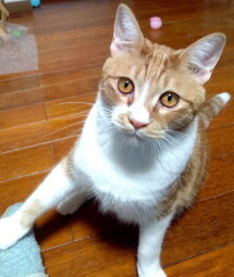 | 特徴(性格など) | 【仮称:健(たける)】 茶トラ色のアメショ柄の男の子です。 保護当初は重篤な肺炎にかかっておりましたが、現在はよく食べ、よく遊び、ぐっすり眠り、すごく元気で大きくなりました。 耳と目が大きいのが印象的で、首の周りの白い毛だけふわふわとしています。 真っ直ぐなしっぽでバランスをとり、キャットタワーにも飛ぶように登っていきます。 最近は体重も増え、パワフルになりました。遊びもとても豪快です。 現在4匹のお兄さん猫と同じ歳の2匹(りお、まお)と暮らしており、毎日がにゃんこプロレスと追いかけっこの運動会で鍛えており、体力、運動能力の高い猫に成長しています。 また、お兄さん猫達に配慮することができるので、他の猫と暮らす習慣は身についていると思います。 豪快で物怖じしない健くんです。 そのような環境ですので、ひとりでお留守番をした経験が全くなく、ケージに入れた事もありません。 神経質なタイプではないようで、電池が切れたように(え?ここで寝る?)という所で転がって寝ていたりしますが、反面とても甘えん坊です。 保護主が2階へ行けば2階へ、夜は保護主の頭のそばで眠ることが多いです。 食事は1日2回です。 トイレの失敗はありません。 チュール次第で爪切りもブラッシングも出来ます。 走るのも早く、物音がすると玄関に飛んで行きます。 脱走防止対策を実施して、終生完全室内飼育をお願いします。 まだ手のかかる月齢ですので、お留守番時間の少ない、小さなお子様のいない、たばこの副流煙はリンパ腫の発症率を高めますので、ご家族に喫煙者のいないご家庭を希望します。 |