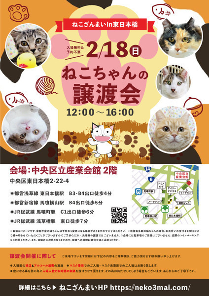 | その他(譲渡条件など) | 11:30より、2階会場入口にて受付を開始します。 受付時に入場予定時間が記入された整理券をお配り致しますので、整理券を受け取った方はお時間になりましたら2階会場入口に番号順にお並び下さい。 ※11:30より早くいらしてもお待ちいただく場所がございません。 また、近隣にお住まいの方や他階フロアのご利用者様にご迷惑となる場合がございますので、受付開始時間にあわせてお越しくださいますよう、何卒ご協力お願いいたします。 ※ねこざんまい譲渡会は、先着順で里親様を決定する譲渡会ではありません。 先に申し込みをした方を優先することもありません。 お話をして、その猫ちゃんに合ったおうちに決めさせていただいております。 12時に開場し、里親様の決定は14時以降となります。 14時以降にご入場の場合、希望の猫ちゃんが決定している可能性があります。 また1頭に対し多数のご希望をいただいた場合、早めに申し込みを締め切らせていただく場合がございますので、予めご了承下さい。 里親様決定は14時以降となります。 その後、迎え入れ準備の説明等のお時間も頂戴しますので、お時間に余裕を持ってご来場下さい。 【新型コロナウィルス感染予防対策について】 譲渡会開催に際し、ご来場下さいます皆様には以下の内容をご理解頂き、ご協力頂けます様お願い申し上げます。 ●入場前の検温とアルコール消毒の実施 ●マスク着用でのご入場=マスク未着用でのご入場はお断り致します ●入場人数の制限をさせていただきます(来場多数の場合は入れ替え制となります) ●時間と人数の制限=密になる事を防ぐ為に入場人数とお時間の制限を設けさせて頂きます その為お待たせしてしまう場合もございます ●会場利用規約により、ご来場者様の連絡先を控えさせていただきます あらかじめご了承下さい。 諸々の制限がございますが、安心・安全な譲渡会運営のためにご理解・ご協力いただきますようお願い申し上げます。 ~~~~~~~~~~~~~~~~~~~~~~~~~~~~~~ ★仔猫ご希望の里親様★ 仔猫ちゃんたちは、まだ体がしっかりしていない赤ちゃんです。 下痢だけでも数時間対応ができなかっただけ死に至る事もあります。 その為、月齢に応じたお留守番時間を設けさせていただいております。 また、子猫ちゃん(6ヶ月未満)の里親様には子猫支援金のご協力をお願い致しております。 ★猫ちゃんとのお見合いは譲渡会で!★ ねこざんまいの猫ちゃんは譲渡会でのお見合いのみとなります。 『この子はいつ譲渡会に参加するの?』『譲渡会場の場所はどこ?』などは、ねこざんまいホームページをご覧ください。 https://neko3mai.com/ ★楽しく猫ちゃんと触れ合って★ ねこざんまい譲渡会は、猫ちゃんも里親様も保護主も笑顔で過ごせる譲渡会を目指しています。 これから20年以上、楽しい時も、悲しい時もいつも傍にいてくれる大切な家族になる猫ちゃんです。 会場には沢山の猫ちゃんがいます。 1匹1匹、触れ合って猫ちゃんとお話してください。 『初めて猫ちゃんを家族に迎える方』 『先住猫ちゃんのお友達を迎える方』など トライアルの仕方や先住猫ちゃんと仲良くなるコツなど経験豊富な保護主やスタッフにお気軽にご相談ください! 猫を愛し、そして猫に愛されている猫好きスタッフと保護主がアドバイスさせていただきます。 ★里親希望のみなさまへ★ ペットではなく、家族一員としてたっぷり愛情を注いでくださるご家庭をお待ちしております。 恐れ入りますが ●学生の方、子猫・幼猫希望の60才以上の方のみのご家庭 ●脱走防止対策にご協力いただけない方 は原則譲渡を遠慮させていただいております。 ●一人暮らし・同棲(事実婚)の方 保護主の希望や猫の年齢・性格等により、ご希望に添えない場合もございます。 参加猫ちゃんは、それぞれ保護主(実際に猫ちゃんを自宅に入れ、保護をしている方)が異なります。 詳しい条件なども異なる場合がございますので、会場内で直接保護主とお話ください。 〖共通条件〗 1.終生飼育 2.完全室内飼い 3.脱走防止対策へのご協力 4.避妊去勢手術 5.契約書類へのサイン 6.定期報告 7.医療費等の負担 当日の猫ちゃんを連れて帰ることはできません。後日、保護主が里親様のご自宅までお届け致します。 その為、移動の際の猫ちゃんの負担を月齢などから考慮し、お届け地区を限定させて頂くこともございますのでご了承ください。 ご理解とご協力のほど宜しくお願い致します。 ☆よくある質問☆ ・譲渡の条件 ・ご負担頂く費用 ・譲渡会の場所等は ホームページに詳しく掲載させて頂いておりますのでご覧ください。 https://neko3mai.com/ メールでのお問い合わせはすぐにご返答出来ない場合がございますのでご了承ください。 ホームページ https://neko3mai.com/ お問い合わせ http://www.neko3mai.com/contact/form_general.html ねこざんまいブログ http://ameblo.jp/neko3mai/ |