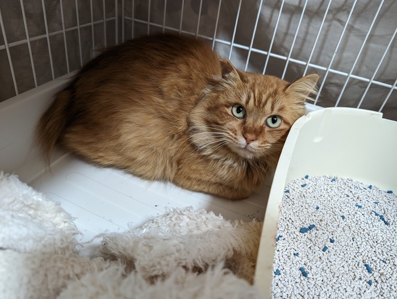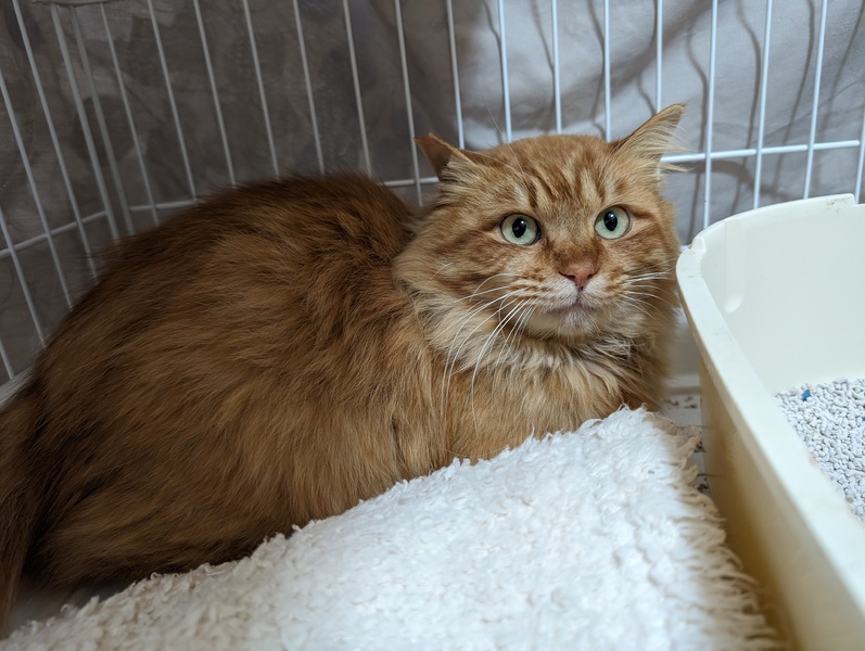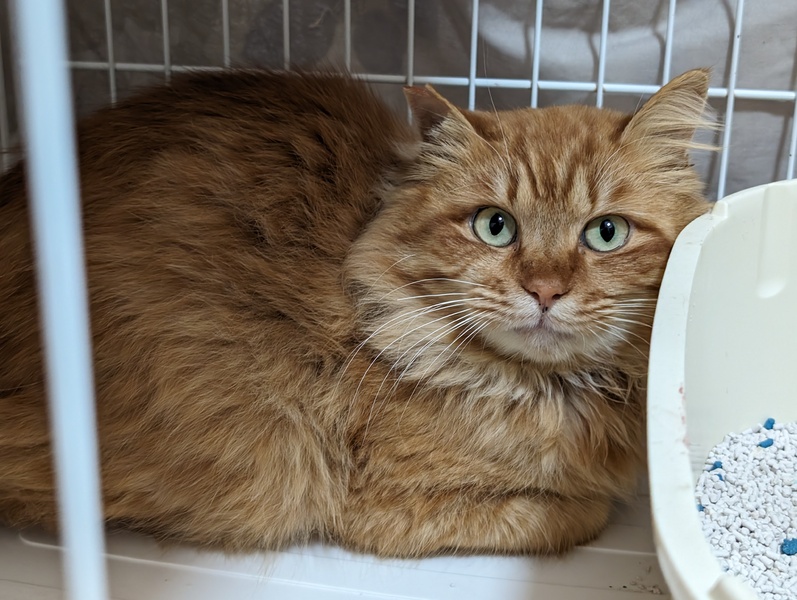 | 特徴(性格など) | 保護したての時は威嚇がありましたが、すぐに慣れそうです。 茶トラ長毛さんでゴージャス感があります ノミダニ駆除済み ワクチン接種済み ご連絡を頂きましたらウイルス検査予定です |