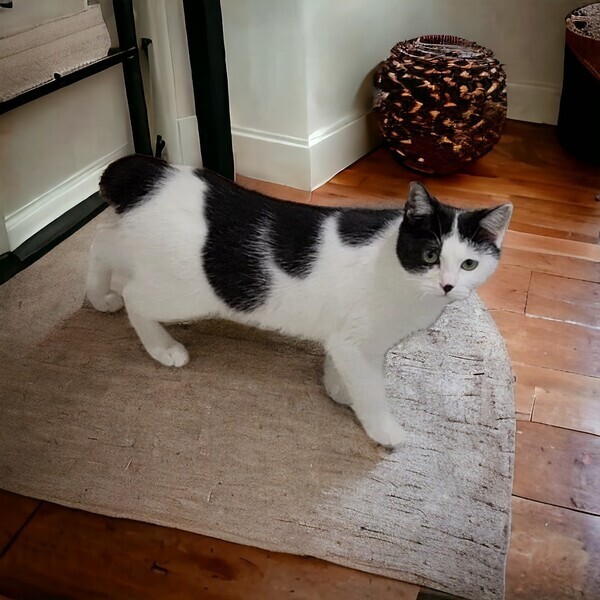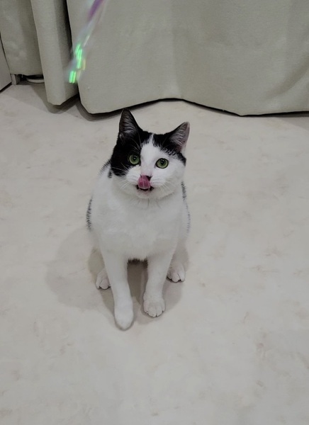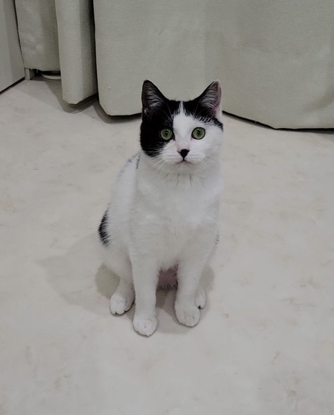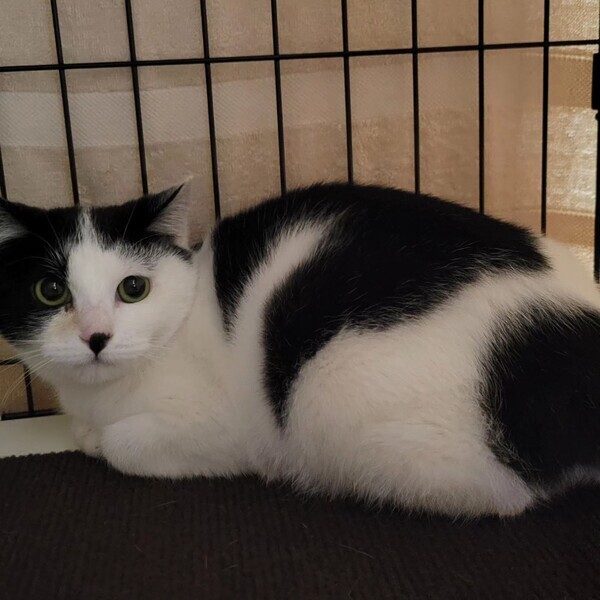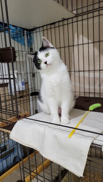 | 特徴(性格など) | 2023.8.1生まれ(推定) 毛色:白黒 とっても慎重派で大人しい性格です。 昼間はケージの中で寝ていることが多いですが、夜になると活動的になり おもちゃで遊ぶのも好きです。 猫とも仲良くしたい様子です。 撫でると気持ち良さそうな顔でゴロゴロいいます。 抱っこも緊張気味ですができます。 短いしっぽと独特の白黒模様がチャームポイントです。 |