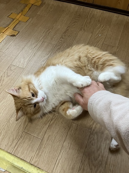 | 特徴(性格など) | 茶白の半長毛。フサフサの 長い尻尾。 優しい穏やかな子です。 決して爪を立てません。 甘噛みもふりだけ。 呼んだら来ます。 撫でて欲しくてゴロゴロいいながら付いて回ります。 人、猫、場所見知りしません。 身体は大きいですが、頭の中は子猫です。 ご飯大好き。 エイズ、白血病陰性。 便検査顕微鏡検査まで陰性。 |