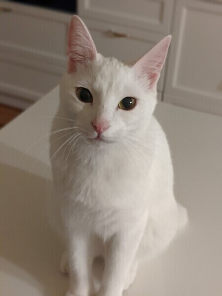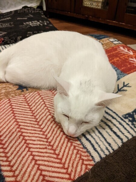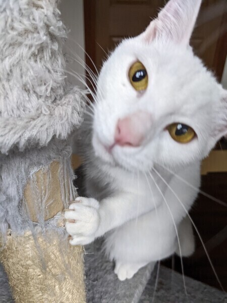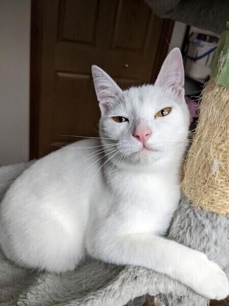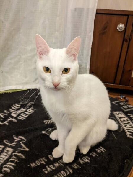 | 特徴(性格など) | 2023.4.26生まれ(推定) 毛色:白 おくらとそっくりな、しっぽが短い白猫女子♪ 人よりも猫が好きなようで、猫同士でいることが多いです。 夜な夜な他の猫と大運動会。 短いしっぽがボワッとなるほど興奮して追いかけっこしています!! 目を細めてニャ~と鳴くので、なぜかおばあちゃん顔になっちゃうかわいい子です。 |