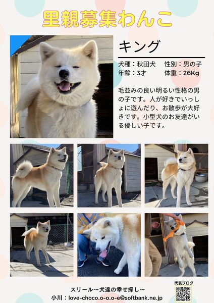 | 特徴(性格など) | 【プロフィール】 名前:キング 年齢:3才 体重:26キロ 性格: 毛並みの良い明るい性格の男の子です。 人が好きでいっしょに遊んだりお散歩が大好きです。 小型犬のお友達がいる優しい子です。 秋田犬の特性を良く理解されている方に迎えていただきたいと思っています。 またキングは大型犬で若いこともあり、力も強いです。 大型犬飼育経験のある方が望ましいです。 代表ブログ: https://ameblo.jp/sourire-hogoinu/theme-10119457944.html スリール公式HP: https://sourire-hogoinu.jimdofree.com/ 【健康状態】 去勢手術:未(3/12) 狂犬病ワクチン:済 混合ワクチン:済(2/27) ノミ・ダニ:毎月 駆虫 :未(これから実施予定) 血液検査:済 大きな健康問題もなくとても健康で元気いっぱいです! |