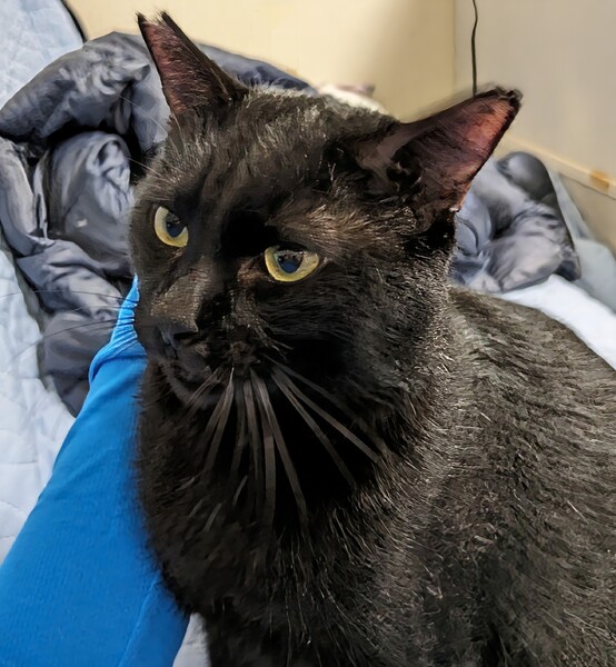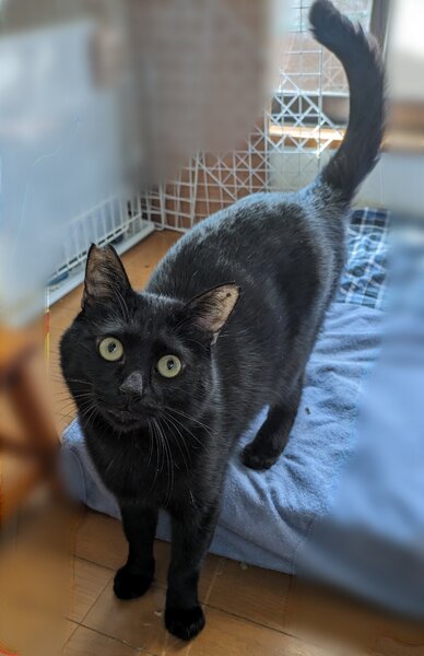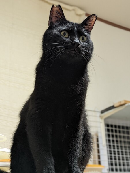 | 特徴(性格など) | 黒猫 多少白毛あり 人見知りはしますが、馴れればべったりの超甘えん坊。 膝に乗ってずっと撫でて欲しいタイプ。 他の猫とも仲良く出来ますが、遊び方はあまり上手ではありません。 猫エイズ陽性ですが、発症はしておらずとても元気です。 但し、慢性の鼻炎があり、くしゃみ・鼻水がよく出ます。 加湿器を使って湿度を高くしておくとだいぶ改善されます。 |