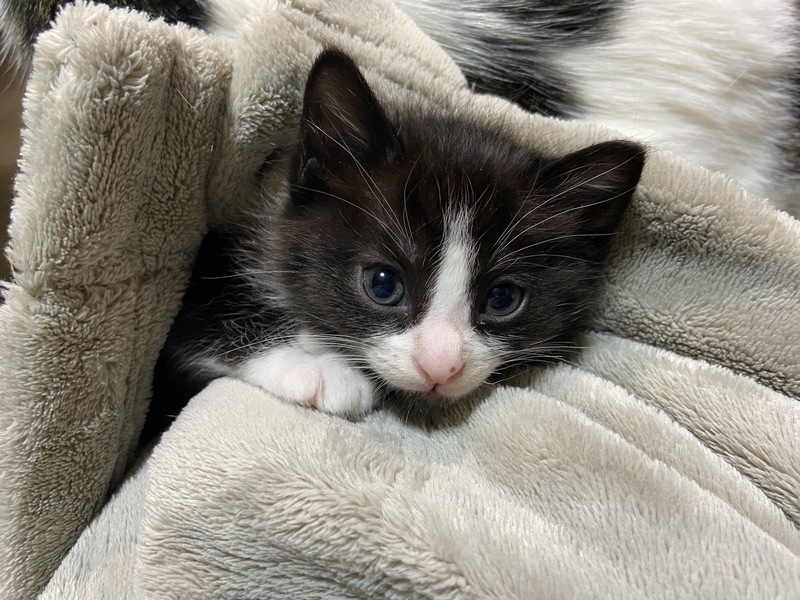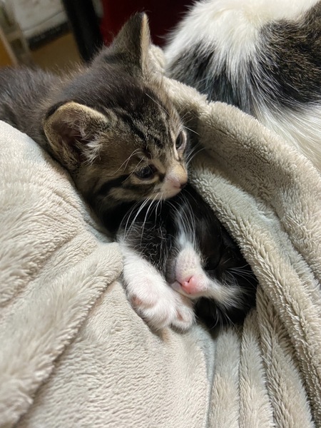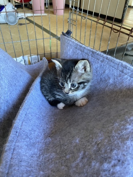 | 特徴(性格など) | 二月に家のそばで見つけ保護しました。 当初は五匹いましたが三匹は死んでしまいました。そのため、無事に生き残ってくれた二匹を引き取ってくれる方を探しています。 一匹はキジトラ柄です。この子はメスで、最近少し鳴き鳴き始めましたが何にもうるさくなくとても良い子です。もう一匹は黒と白の八割れでオスの子猫です。あご下に少し黒い模様が入っていてとても可愛らしい顔をしています。二匹ともとてもおとなしく、まったく悪さをしない人懐っこい子猫です。 ※また本日、離乳に成功しました! 動画でも子猫の様子を撮影していますので、動画URLの方から是非ご覧ください。 |