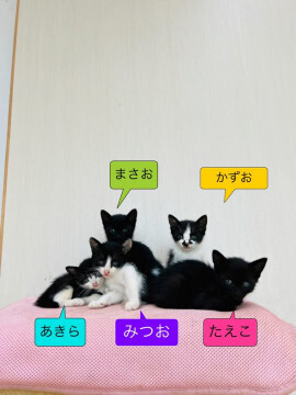 | 特徴(性格など) | フィンガー5兄妹の次男、まさおくん 白いパンツをはいたくるりんかぎ尻尾の黒猫です(^^) 兄弟の中でも小さく、心配しましたが元気いっぱい。 月齢の小さな子猫と混ざってウェットご飯食べたら大きくなりました。 (おかげで少し食いしん坊) 大きくなるにつれて、だんだんと黒い毛に白い毛が混ざって不思議な色の猫さんに大変身! とってもユニークな色のまさおに、素敵な家族希望します‼️ 健康状態良好です。 |