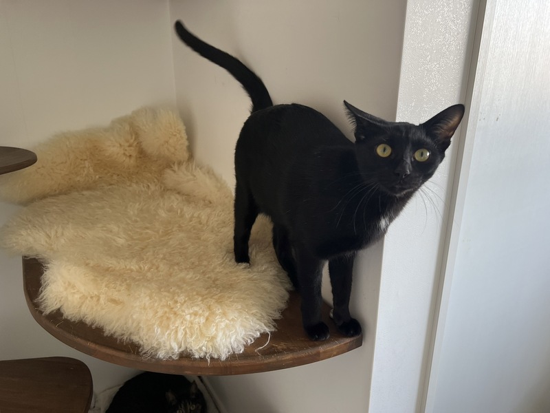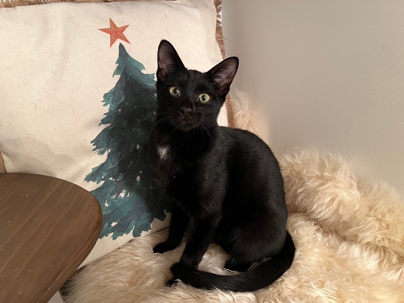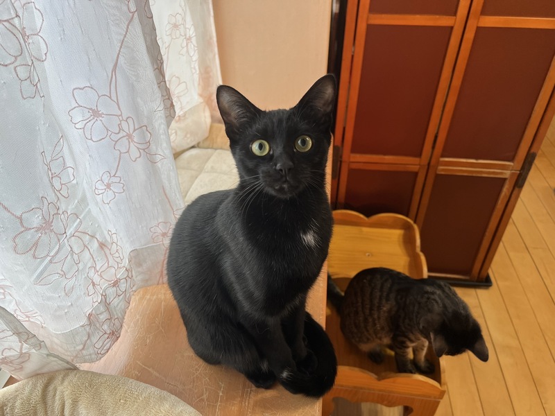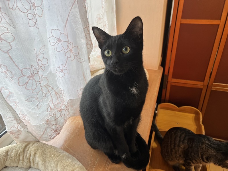 | 特徴(性格など) | 元気いっぱいの甘ったれ 肩に乗るのが大好き お腹の真ん中と尻尾の先だけ白の黒猫くん |