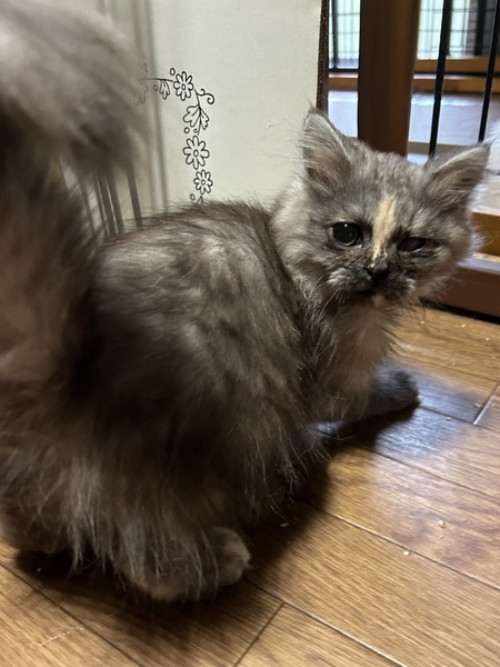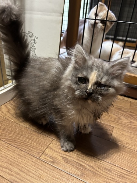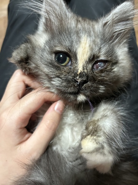 | 特徴(性格など) | サイベリアンのモンちゃん メス、3ヶ月 毛はブルーパッチドタビー&ホワイトです とても甘えん坊で人懐っこいです! ゴロゴロが止まりません 撫でられるのも抱っこも大好きです 遊ぶのも好きです ただ、保護当時にひどく風邪を引いており、その影響から左目が失明してしまっています ですが現在は片目でも特に問題なく生活出来ています 現在(4/10)皮膚糸状菌症(真菌や猫カビといわれるもの)を治療していますが、あと2週間ほどで完治する見込みです |