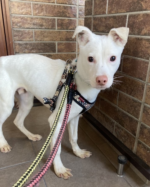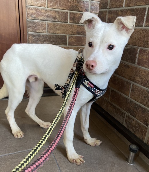 | 特徴(性格など) | 白色 10キロほど、小さめの中型犬です。 オスですが、足を上げずにオシッコしてくれます。 お散歩前にハーネスをする時、前足を上げて協力してくれ、しっぽも振ってくれるようになりました。 だんだんコンタクトもとれるようになってきました。 |
