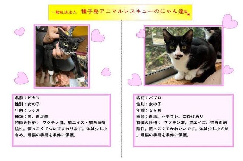 | 特徴(性格など) | ソックスにゃんこのピカソはからだは少し小さめですが、懐っこくてついてまわります。かわいいです。 体調を崩していました。 ピカソのインスタ動画URLです→https://www.instagram.com/reel/C6oFpfDJVo-/?igsh=MWQ1NDkxdnFtbXlpdg== 現在、種子島で暮らしています。 ずっとのお家のご家族さんを待っています。 小さなニャンちゃんはペアで飼うとお留守番も寂しくなく過ごせ懐きも早く新しい環境にも比較的早くに慣れやすくなります。 日程が合えば、リモート面談後、東京都多摩市でのお見合いも可能です。 よろしくお願い致します。 ★健康状態★ 良好です 猫エイズ(FIV) 猫免疫不全ウイルス感染症→陰性 猫白血病(FeLV) 猫白血病ウイルス感染症→陰性 |