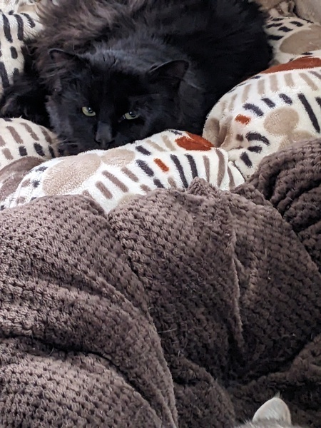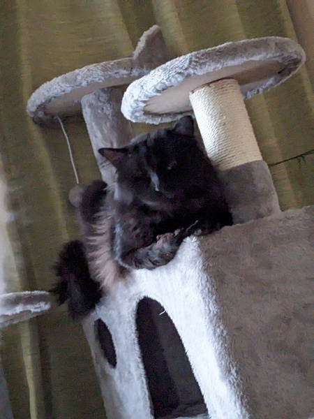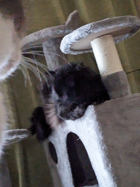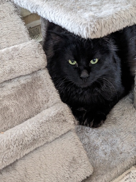 | 特徴(性格など) | ・黒猫中毛雑種 ・メッシュのようなグレーの胸毛有り ・人慣れ修行を経て、噛み付いたり引っ掻いたりしなくなりました。警戒心はやや強め。 ・他の猫とは遊びたがります。 ・食欲旺盛 |