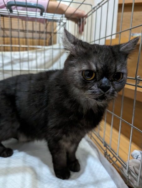 | 特徴(性格など) | 猫は好きではないですが、人は大好きで甘えん坊です。 劣悪な環境で飼われていたと予想される子です。その後遺棄されています。 年齢的に肝臓膵臓の数値が少し高いですが、医師からは問題ないと言われています。 |