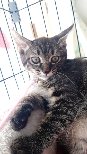 | 特徴(性格など) | 3兄妹唯一のキジトラちゃん 少しビビリだけど、甘えん坊で 人慣れもしてます(^_^)v |