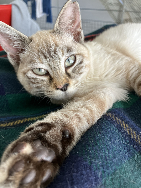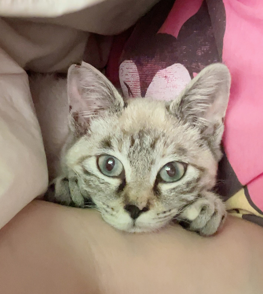 | 特徴(性格など) | キジシャムの女の子「はまぐり」ちゃん 最初はちょっとビビりさんですが 人は大好き 人と一緒に寝たがり 常にそばにいたがります トリモチ(ネズミ捕りシート)を踏んでしまったようで そのべとべとを自力で取ろうとしたのためが、すっかり後ろ足の一部が ハゲでしまっていますが(涙)、毛は生えそろいます! 他の猫ちゃんにも興味深々ですが 相性があるかな、という感じです 餌やり場にいたおじいちゃん猫とは仲良くしていました 現在、保護場所にいる先住猫とは一定の距離を保っています |