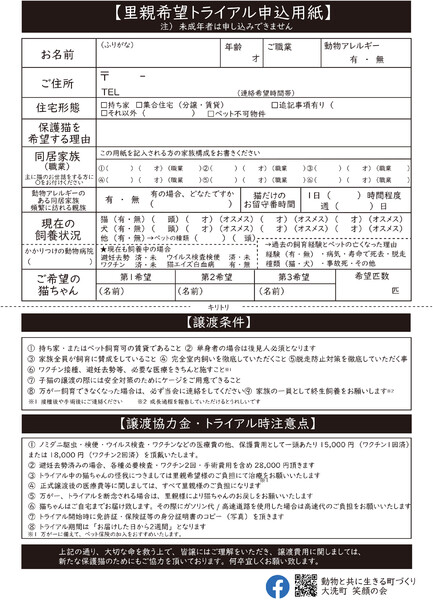 | 譲渡費用(医療費、交通費など) | 初期医療・駆虫・ワクチン1回・避妊手術費用・譲渡協力金として25000円の協力をお願いしております。 茨城県内ですので交通費はいただきません。 |