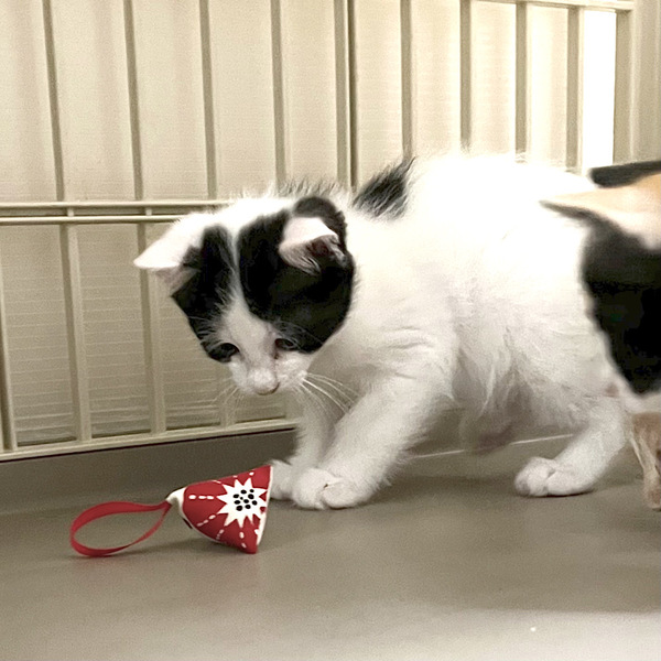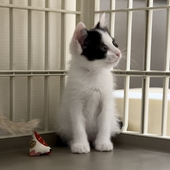 | 特徴(性格など) | タレ目のおっとりとした顔と背中の●二つがチャームポイントです。尻尾はぐるぐる。短めのカギしっぽです。 おっとりマイペースな性格で、いつもきょうだいの後ろから、よく確認して行動します。 毛繕いをしてもらっても、じゃれあいを仕掛けられてもボーッとしている穏やかな子です。 野良猫お母さんから離乳したばかりなので、まだ人にゴロゴロではありません。これからの接し方で人間大好きになる可能性が高いと思います。 |