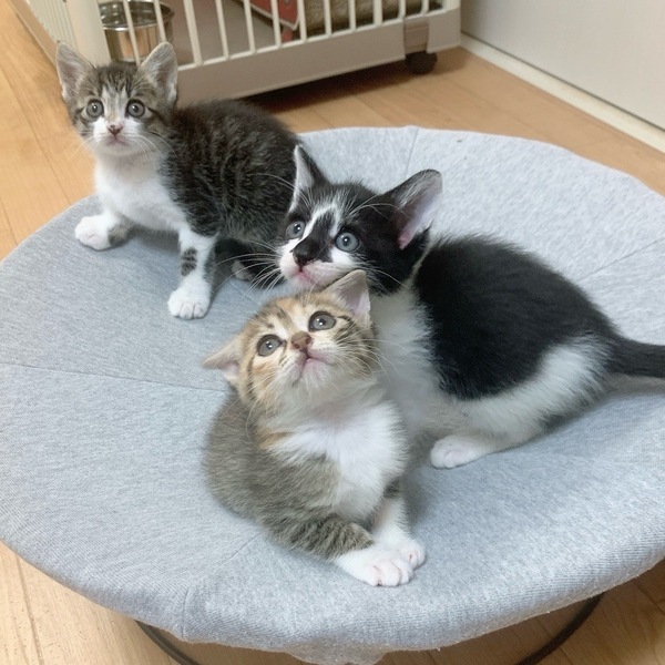 | 特徴(性格など) | ミルクから人間が育てているので人間に警戒心がなく甘えてきます。3兄妹の中で一番おっとりしていてマイペースな癒し系です。兄妹とのにゃんプロもとてもゆるゆるで、見ていて思わず微笑んでしまう可愛さです。離乳食もしっかり食べて、現在はカリカリにも挑戦中!可愛いソプラノボイスで「きぃぃぃ~」と鳴きます(笑)これからどんな子に育っていくか楽しみです。 トイレもしっかり出来ています。 マックくん・ララちゃんとは3兄妹です。茶トラの長介くんとも一緒に遊んでいます。みんな仲良しなので2匹一緒のご縁があるとなお嬉しいです。 まだまだ小さい子猫なので、健康管理をしっかりしてくださる方、安全に暮らせる様にお部屋のお片付け(子猫なので誤飲などに注意が必要です)、目に見える形での脱走防止対策を徹底してくださる方、また長時間のお留守番のないご家庭を希望しています。対策等でわからないことは アドバイスさせていただきますので、疑問点などは遠慮なく聞いていただきたいです。 ご自宅の玄関・開ける窓・ケージを置くお部屋などのお写真をご持参いただきますと、より具体的なお話ができると思います。 |