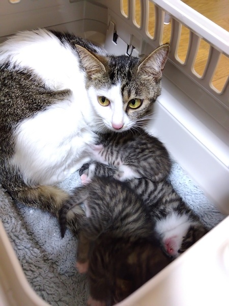 | 里親募集する理由 | 他県で保護されました。 元々飼われていた猫さんですが、4月末の引越しの際に置いて行かれたそうです。 2歳位と聞いています。5/3前後に子猫を3匹産んでいます。 お母さん猫さんと子猫1匹を一緒にお迎えいただける方にお譲りしたいと思っています。 |