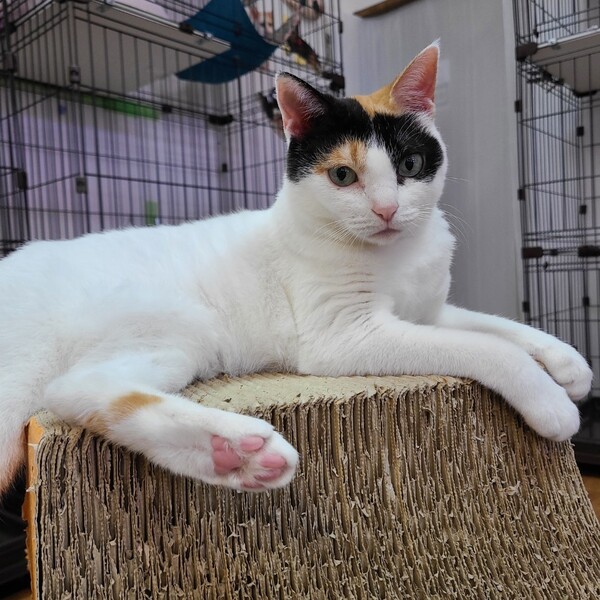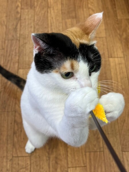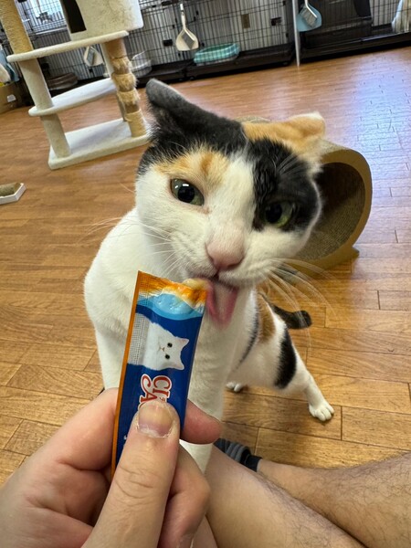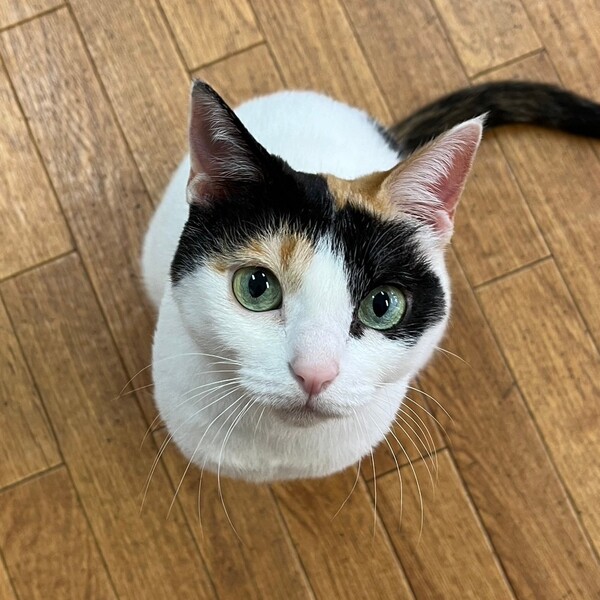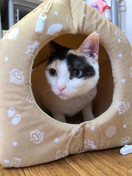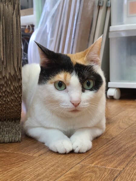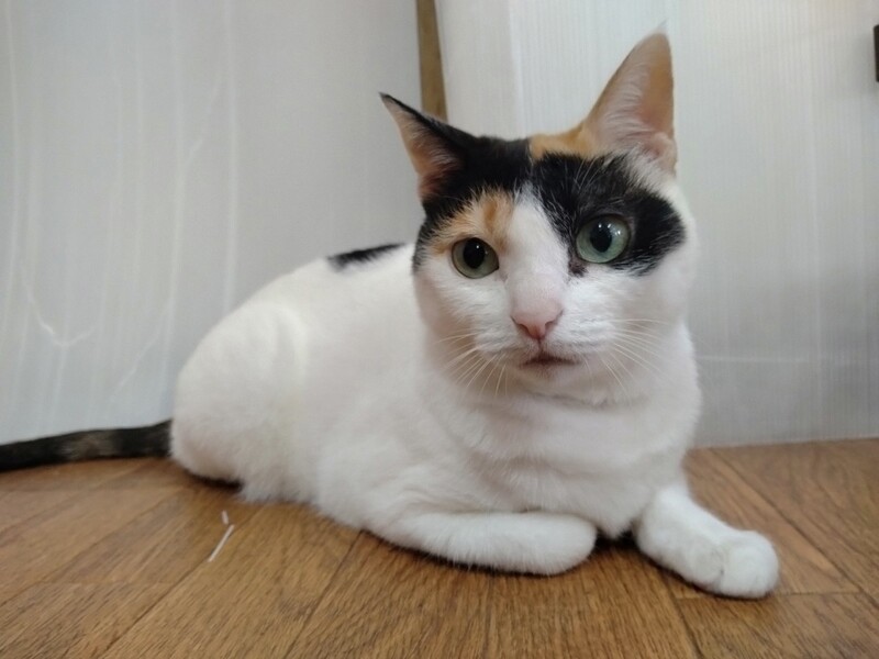 | 特徴(性格など) | 2019.3.1生まれ(推定) 毛色:三毛 かわいい三毛猫さん。 頭の黒とオレンジの配置が、市松模様のクッキーを思い浮かばせます♪ 人にも慣れていて抱っこで爪切りもOK。 甘えんぼさんで、食いしんぼさんなところもかわいいです♡ 姉妹猫のパレと同じく小柄で、薄いグリーンのおめめが美しい子です。 運動神経はバツグン!遊ぶの大好きな元気娘です。 |