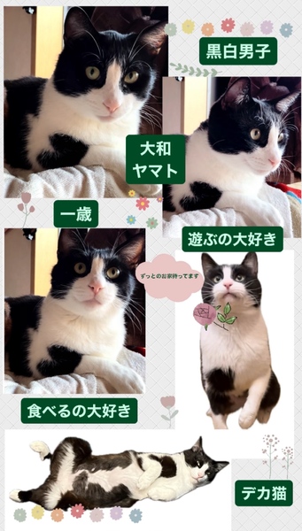| 特徴(性格など) | 黒白猫 7kgの大きめの子です 遊ぶの大好き食べるの大好きです |