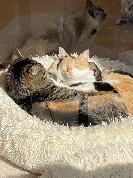 | 特徴(性格など) | ごまくん 2歳11ヶ月の男の子です。 ちょっぴりシャイで優しい性格のゴマくん。 妹思いのお兄ちゃんで 小さな妹マメちゃんにいつも優しく寄り添っています。 大きく立派な体格ですが 同室の小さな子猫たちにも、とても優しく 抱っこして一緒にお昼寝したり グルーミングしてあげたり、頼れるお兄ちゃんです。 特に、あんみつちゃんとは仲良しで いつも二人で一緒、夫婦のようです。 人に対しては ちょっぴりシャイで、初対面の方がお部屋に来ると 緊張して隠れてしまうのですが なでなでをしても、じっと我慢して 決して、威嚇したり、攻撃したりしない優しい子です。 大好きなおもちゃ遊びの時は元気いっぱい大ジャンプをしています。 初めは緊張してしまうと思いますが 人も猫も大好きな甘えん坊です。 小さな姪っ子ちゃん(5歳と3歳)とも 仲良く遊んでいるので 初めて猫ちゃんと暮らす方、 小さなお子様のいるお家でも一緒に暮らしやすい猫ちゃんだと思います。 おトイレや爪切り 通院やお薬も上手にできます。 ☆写真の補足 3~5枚目…仲良しのあんみつちゃんと一緒に。 ☆仲良しの子☆ とろちゃん、ごまざばちゃん、あんみつちゃん ごまくん、まめちゃんは赤ちゃんの頃から一緒の大の仲良しです。 *まめちゃんが妹です。 みんなの成長の記録や、日常の様子は インスタグラム...@fuuchannel よりご覧いただけます。 |