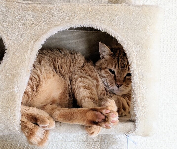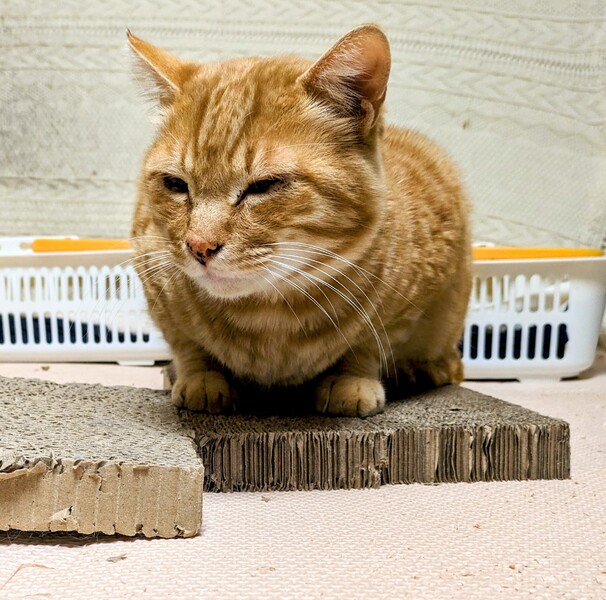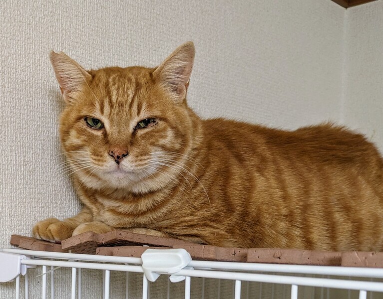 | 特徴(性格など) | かなりおデブな茶トラくんです。 外で10年くらいボス猫として生きてきたボスくんです。 元ボス猫とは思えない程、気弱で引っ込み思案で、とても優しい猫です。 他の猫とは仲良くできますが、自分から行くタイプではなく、来てくれるのを待っているタイプです。 人馴れ修行中で、まだ少しシャー言ったり、可愛いパンチを出して来たりもしますが、撫でたりブラッシングをしたりすると、喉を鳴らしてゴロンとして喜んでくれます。 |