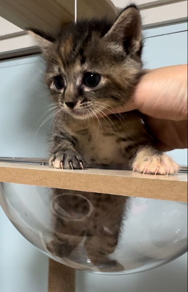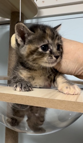| 特徴(性格など) | キジトラ柄にオレンジ色がパッチワークのように入ったちょっと珍しい毛色の女の子。 お腹が空いた時、遊んで欲しい時はっきりと意思表示ができます。 兄妹の黒猫くんとよく遊び、よく寝てスクスク成長中! 生まれてすぐに人の手で育てているので人が大好きです。 |