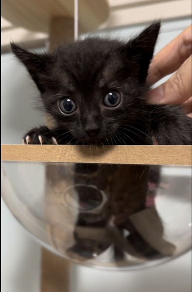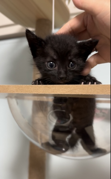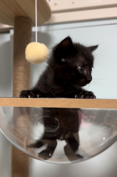 | 特徴(性格など) | 美しい黒毛を持つ優しい男の子 兄妹の麦わら猫ちゃんととっても仲良しです。 写真で見るより実物の方が可愛い子? 生後まもなく人の手で育てられたので人が大好き! 懐っこく優しい性格で黒猫特有の甘えん坊さんになること間違いなしです。 将来は漆黒のイケメン黒猫?⬛になる予定 |