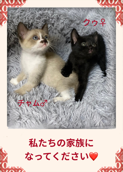 | その他(譲渡条件など) | お届け希望の場合はご自宅にお届けいたします。 見学でお見合いが成立したらトライアル開始となります。 トライアル期間は2週間。その間はLINEなどを交換して画像付きで様子をお知らせくださると嬉しいです。 ペット可の住宅にお住まいで、年一回のワクチン接種、完全室内飼い、終生飼育をお約束くださる方、何かあったときには迷わず病院に連れて行ってくださる方にお願いしたいと思います。 女性のお一人暮らしの方はご実家の後見があれば大丈夫です。 申し訳ありませんが、男性お一人、未婚のカップルの方はご遠慮ください。 チャムくん、クゥちゃんとの良いご縁をお待ちしております❣️ |