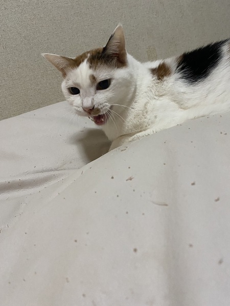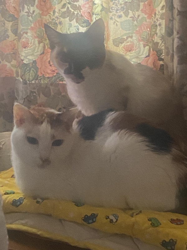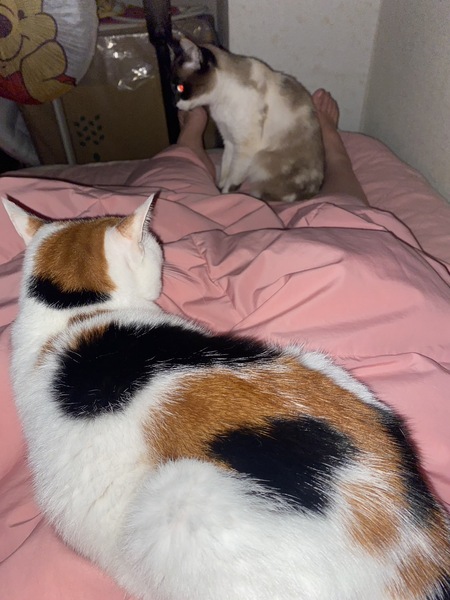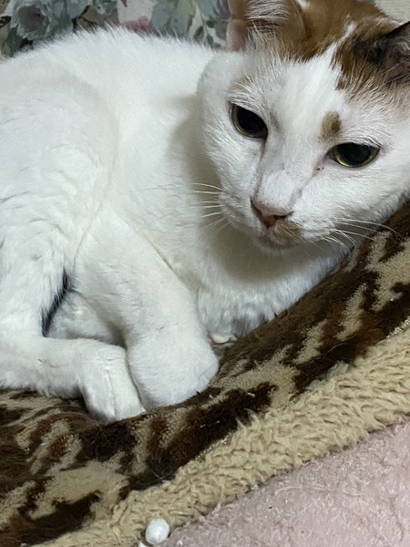 | 特徴(性格など) | ①ミーちゃん、メス、三毛、13~14歳 避妊済み、ノミ・ダニ駆除済み、ボブテイル。 ②グレーちゃん、メス、シャムMIX、13~14歳 避妊済み、ノミ・ダニ駆除済み、ボブテイル。 目はグレーで瞳は赤いです。 2匹とも小柄です。 姉妹ではありませんがとても仲良しです。 ●猫の様子 最初の2日くらいは怖がって引き籠っていましたが、いままでお外で暮らしてたわけではなく室内飼いの猫でしたので、すぐに慣れて甘えてきました。 私が寝る時は必ず一緒にベッドに乗って来て甘えたり、私のお腹の上でくつろいだりしています。 飼い主さん宅では人間の食べ物ももらっていたようでした。 トイレの失敗もありません。 おもちゃでも良く遊び、とてもシニアとは思えないお茶目な子たちです。 |